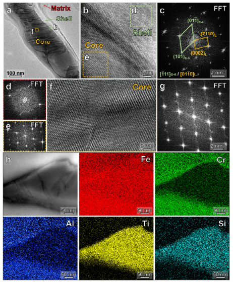 图 11。加热至 1273 K 后水淬后的铸态合金样品的 TEM 分析。(a) 放大率相对较低的 STEM-BF 图像。(b) 包含 Laves 相沉淀的典型区域的放大图。(c,d)分别来自基质-壳区域(由 b 中的红色圆圈突出显示)和核 - 壳区域(由 b 中的金丝雀圆圈突出显示)的 SAED 图案。(e) 基体与壳之间界面的 HRTEM 图像。(f) 核壳界面的 HRTEM 图像。(g) 含有 Laves 相析出物的典型区域的 STEM-BF 图像和合金元素(即 Fe、Cr、Al、Ti 和 Si)的相应 STEM-EDS 图。