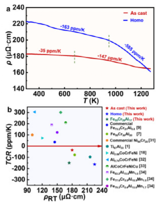 近年来,多组分高熵合金 (HEAs)、复杂浓缩合金 (CCA) 或多主元素合金 (MPEA)的概念显著拓展了成分探索的空间。具有优异的力学和功能性能的合金,例如,通过引入共格有序的 FeCoNiTaAl HEA,实现了机械和软磁性能的完美结合。纳米沉淀进入面心立方 (FCC) 矩阵。HEA 也是实现高电阻率的有希望的候选材料,因为多种主要元素可能会引起显著的晶格畸变,从而促进传导电子的散射。例如,具有有序伪二元 B2-BCC 结构的 Al 2.08 CoCrFeNi HEA 在4.2 K 和300 K 时的电阻率分别为 117.24 μΩ cm 和 119.90 μΩcm。最近,已证明高度分散的析出物对Al x CoCrFeNi (1.0 ≤ x ≤ 3.0) HEA 的TCR值有很大影响。然而,迄今为止报道的多组分 HEA 的电阻率值仍然不是很高(通常低于 120 μΩ cm),并且TCR值主要在较窄的温度范围内进行测试,例如从 4.2 K 到 300 K。在这方面,仍需要大量的研究工作来进一步开发具有改进性能的多组分电阻合金。