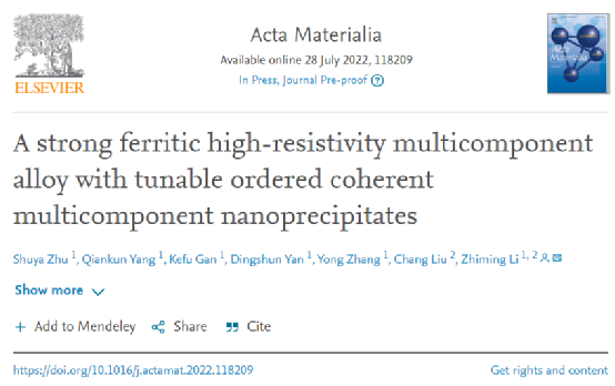基于此,在这项工作中,中南大学材料科学与工程学院李志明团队通过引入有序的相干多组分,开发了一种很有前景的铁素体多组分电阻合金,将纳米沉淀进入合金基体。相关研究成果以题“A strong ferritic high-resistivity multicomponent alloy with tunable ordered coherent multicomponent nanoprecipitates”发表在增材制造顶刊Acta Materialia上。