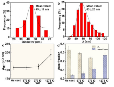 图 12。(a) 尺寸分布和 (b) 相干多组分的间距特征铸态合金样品中的纳米沉淀物。(c) 样品在各种条件下的室温电阻率,即铸态和加热到 673 K (673 K-WQ)、973 K (973 K-WQ) 和 1273 K (1273 K-WQ) 之后通过水淬(WQ)。(d) 面积分数和 Laves 相沉淀。
