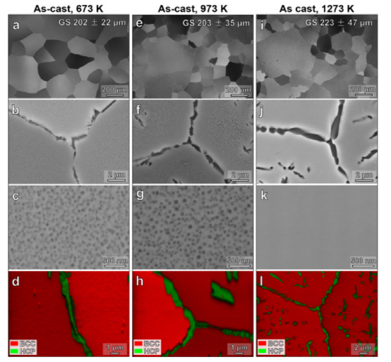图 10。加热至 (ad) 673 K、(eh) 973 K 和 (il) 1273 K 后水淬后铸态样品中显微组织的 BSE 图像和 EBSD 相图。