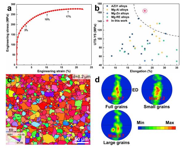 图1 (a) 合金拉伸曲线;(b)UTS YS和伸长率分布图;(cd) EBSD。