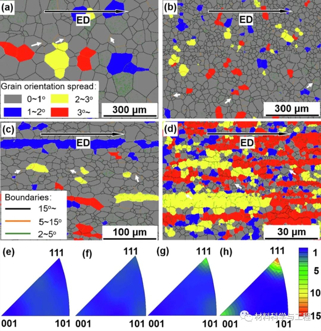 图4挤压后合金的(a - d) GOS图和(e - h)反极图