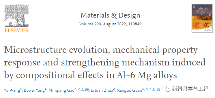 东北大学&大连交大&山东理工等单位的研究团队基于成分设计的理念,研究了添加Mn和/或Sc元素的Al-Mg合金的组织演变和力学性能,提出Al-Mg-Mn-Sc具有很大的改善力学性能的潜力。相关论文以题为“Microstructure evolution, mechanical property response and strengthening mechanism induced by compositional effects in Al–6 Mg alloys”发表在Materials & Design。