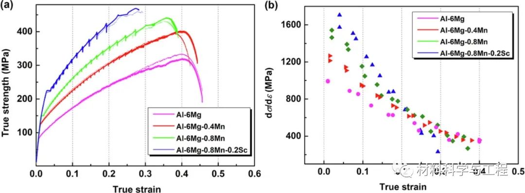 添加0.4 wt%和0.8 wt%的Mn可以提高加工硬化速率。这可能与晶粒和Al6Mn相的细化有关,Al6Mn相对位错有钉扎作用,增强了强度。纳米Al3Sc弥散相体阻碍了位错的运动,导致加工硬化速率增加。同时,Al3Sc弥散相/Al6Mn相与基体之间的不协调变形有助于提高加工硬化速率。挤压成形Al-6Mg-0.8Mn-0.2Sc合金伸长率低主要有两个原因,一方面,较低的再结晶分数导致合金中位错密度较高,降低了合金中位错的存储能力;另一方面,由于钉扎效应,纳米Al3Sc弥散相和Al6Mn相延缓了合金的恢复和再结晶。