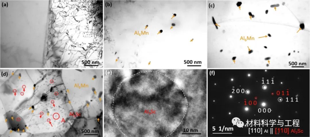 通过对比挤压前后的显微组织发现,在Al-6Mg-0.8Mn-0.2Sc合金中,观察到的长条状白色相细化为短棒状或块状相。更重要的是,随着Mn元素的加入,纳米Al6Mn相的数量减少,呈菱形或板状。Sc元素的加入导致晶粒细化,促进了Al6Mn相的析出。经热挤压后,Al-6Mg-0.8Mn-0.2Sc合金中纳米Al6Mn相数量减少;Al6Mn相的形貌转变为菱形/板形,平均长度从500 nm左右减少到50~150 nm。
