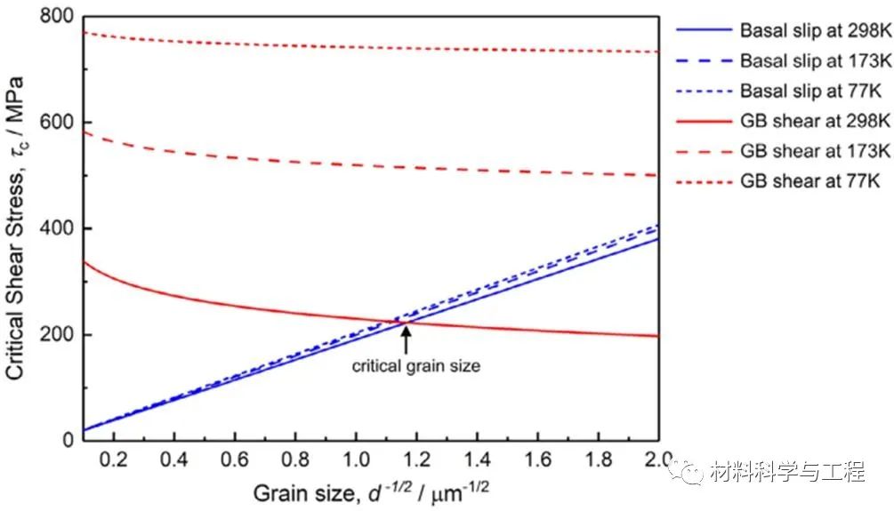 图6. 晶界滑移和基面滑移的临界激活应力随晶粒尺寸和加载温度的变化趋势。室温条件下,超细晶样品更易发生晶界滑移,然而低温条件下晶界滑移所需的应力大幅提高,位错滑移重新成为超细晶样品的主导塑性变形机制。
