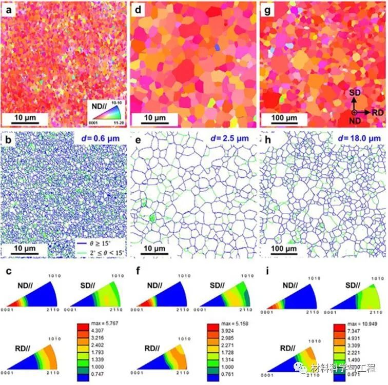 图2. 采用剧烈塑性变形技术制备的不同晶粒尺寸纯镁的微观组织和织构图。该样品为直径30mm,厚度约1mm的片状样品,满足可靠的力学性能测试要求。