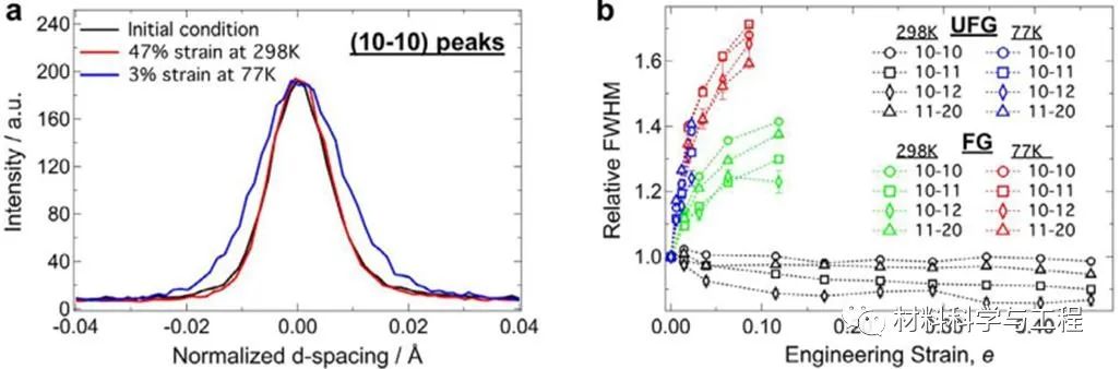 图4. 超细晶(d=0.6μm)和细晶(d=2.5μm)纯镁样品的中子衍射峰半高宽(FWHM)随应变量的变化规律图。室温条件下,超细晶纯镁的衍射峰半高宽几乎不发生变化,而液氮温度下发生快速的宽化,表明位错等晶体缺陷的快速累积。