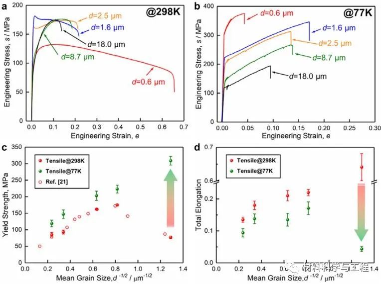 图3. 不同晶粒尺寸纯镁的室温及低温拉伸应力-应变曲线,以及屈服强度和延伸率随晶粒尺寸的变化关系。