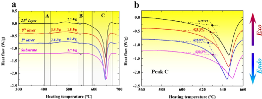 图3 WAAM制备的Mg-4Y-3RE-0.5Zr合金不同沉积层的DSC分析