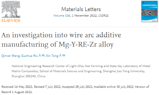 近日,上海交通大学轻合金精密成型国家工程研究中心吴国华教授团队在镁稀土合金电弧增材制造方面取得重要研究进展,研究成果以“An investigation into wire arc additive manufacturing of Mg-Y-RE-Zr alloy”为题,发表在金属材料学术期刊《Materials Letters》上。硕士生王岐蔓为第一作者,吴国华教授和童鑫博士为共同通讯作者,该研究得到了国家自然科学基金的资助。