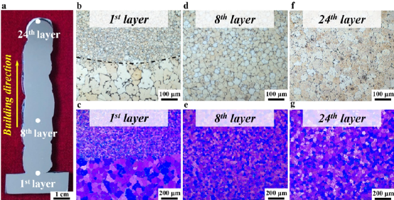 在该研究中,吴国华教授团队创新地采用了电弧熔丝增材制造(WAAM)技术实现了Mg-4Y-3RE-0.5Zr合金的制备,并首次报道了电弧熔丝增材镁稀土合金的组织不均匀性及其形成机制。研究表明,由于交流电弧独特的阴极清理效应以及合金丝材较低的比表面积,WAAM工艺所制备的镁稀土合金中并未发现明显的氧化夹杂缺陷。另一方面,相比较于LPBF工艺而言,WAAM较大的热输入使得熔池的冷却速度较小,能有效降低合金凝固时的收缩应力,抑制裂纹萌生。