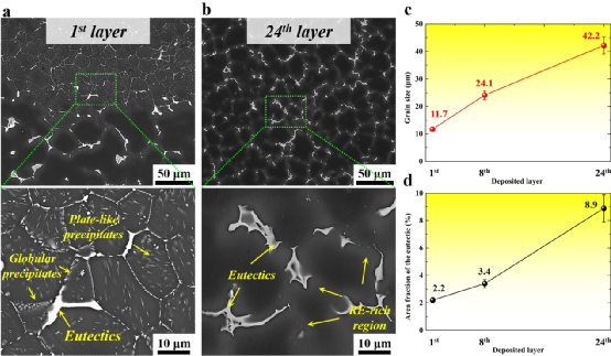 本研究通过对沉积层不同高度的显微组织进行表征,揭示了Mg-Y-RE-Zr合金在电弧熔丝增材制造过程中的组织演变机制。实验结果表明,随着沉积高度的不断提高,沉积层的冷却速度逐渐降低,导致了沉积层晶粒尺寸沿高度方向逐渐粗化。此外,电弧加热导致的多重热循环会对已沉积层形成“原位固溶”和“原位时效”的效果。沉积层底部的共晶组织在多重热循环的作用下首先发生溶解,随后稀土元素又在多重热循环的作用下下沉淀析出,在晶界和晶内形成了弥散分布的β’和β1相。沉积层顶端组织主要由粗大的α-Mg枝晶和连续粗大的共晶组织组成,并未发现稀土沉淀相的存在。由于WAAM工艺制备的Mg-Y-RE-Zr合金中存在明显的组织不均匀性,其在沉积高度方向上的力学性能也存在显著差异。该研究首次报道了镁稀土合金电弧熔丝增材的相关研究,为高性能镁稀土合金的增材制造技术开辟了新视野。