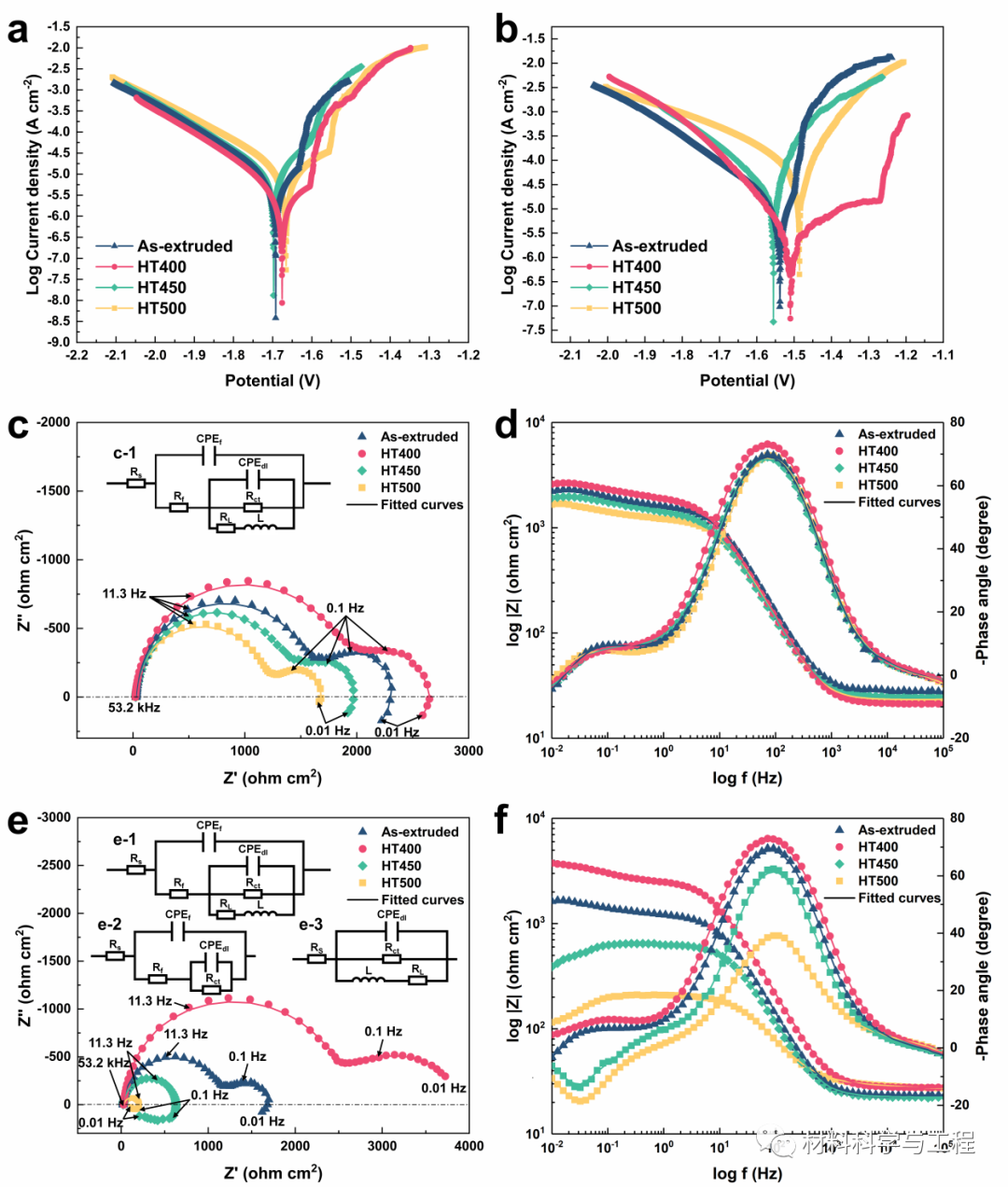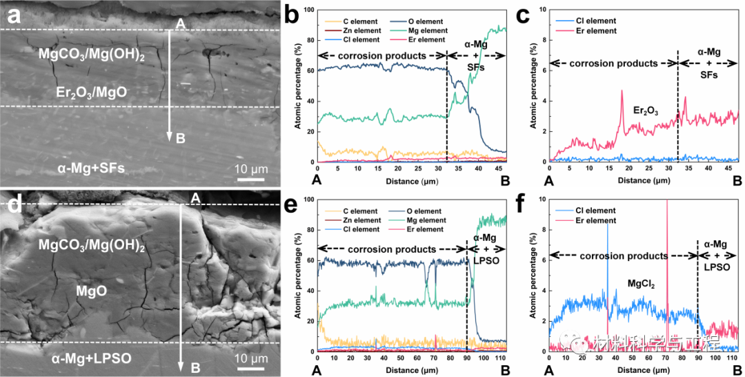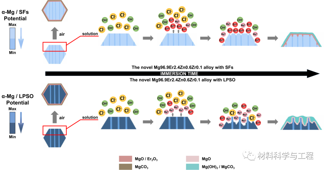 另一方面,证实SESFs作为弱阳极优先腐蚀能够提高腐蚀膜层保护性。这主要是因为富含稀土溶质的SESFs作为弱阳极优先腐蚀,易释放更多的Er3+(图5和图6),大量的Er3+会捕获和阻止有害阴离子(Cl-)通过腐蚀膜,电化学极化和阻抗测试表明膜层具有更好的钝化效果(图7)。而对于含有LPSO相镁合金而言,作为阳极的镁基体优先受到微电偶腐蚀,释放较少的Er3+,这使得LPSO增强镁合金的腐蚀膜保护性不如SESFs增强镁合金。基于SESFs和LPSO结构的独特作用,揭示了以SESFs为核心的低速率均匀腐蚀微观机理(图8)。