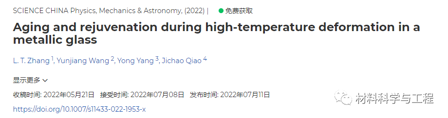 来自西北工业大学的乔吉超教授团队、中国科学院力学研究所王云江研究员和香港城市大学杨勇教授等结合高温变形行为和动力学弛豫谱研究了稀土基非晶合金高温变形过程中老化与回春的竞争过程,阐明了高温变形实现非晶合金回春的物理本质。相关论文以题为“Aging and rejuvenation during high-temperature deformation in a metallic glass”发表在SCIENCE CHINA Physics, Mechanics & Astronomy上。