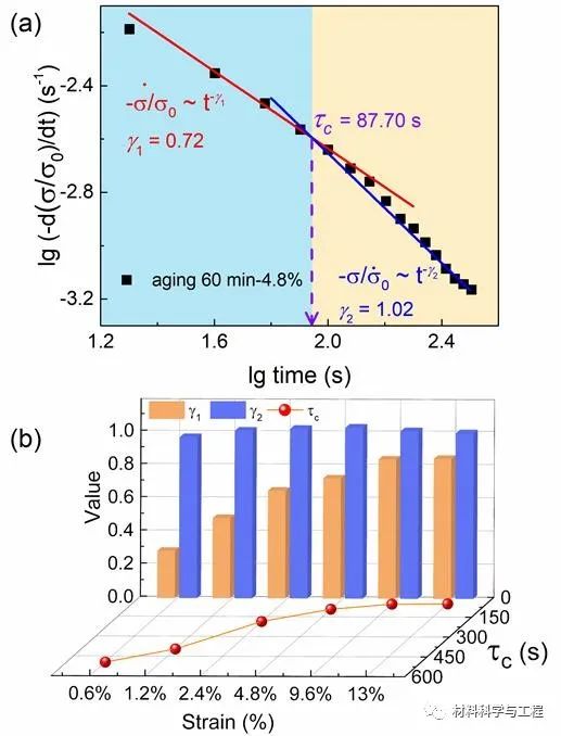 图2. a) 双对数坐标下应力松弛行为呈双阶段幂律过程; b)幂律指数和交叉时间随拉伸应变的演化。
