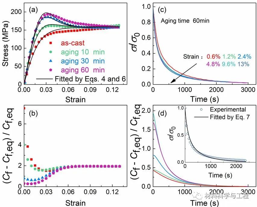 图1. a)不同预老化时间条件下非晶合金的单轴拉伸应力-应变曲线并采用自由体积理论进行拟合; b)拉伸过程中流动缺陷浓度演化; c) 单轴拉伸至不同应变时的应力松弛行为; d) 应力松弛过程中缺陷浓度演化。