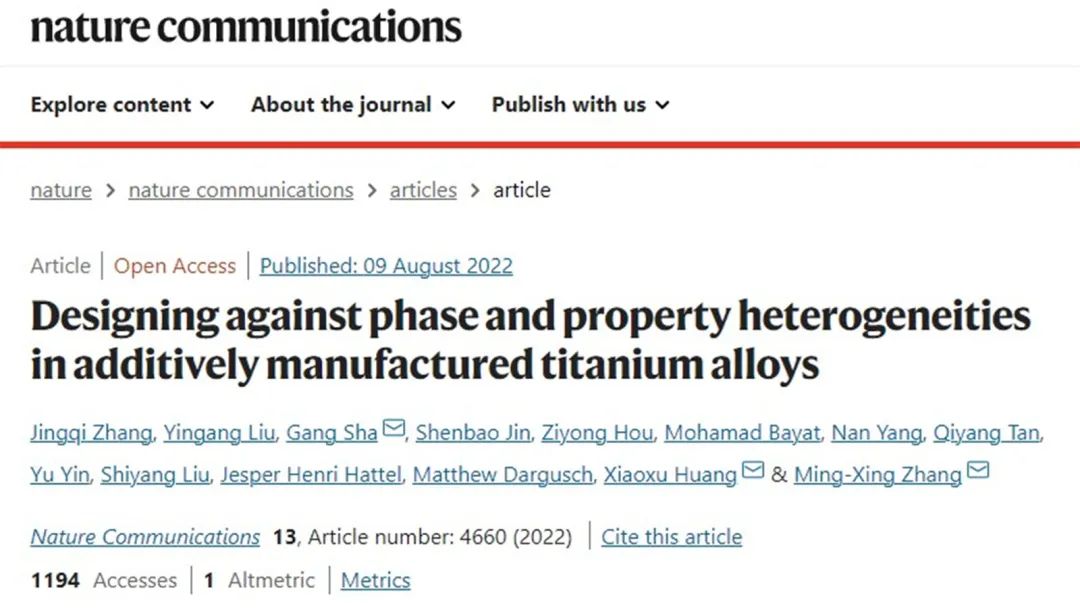 近日,重庆大学材料科学与工程学院黄晓旭教授团队与澳大利亚昆士兰大学张明星教授等研究团队合作,在《Nature Communications》上发表题为“Designing against phase and property heterogeneities in additively manufactured titanium alloys”的研究成果,重庆大学为共同通讯单位,黄晓旭教授为共同通讯作者,材料学院侯自勇副教授为论文共同作者。