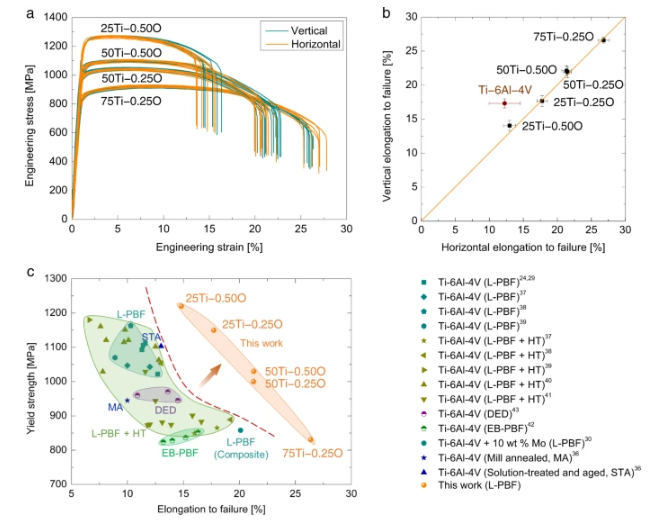 图 1:Ti-6Al-4V 和通过激光功率床融合 (L-PBF) 制造的新开发合金 (25Ti-0.25O) 的显微组织和拉伸性能比较。