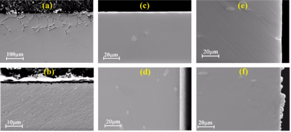 (a) 316H不锈钢在700℃氯化物熔盐中腐蚀后100小时后的截面SEM图;(b) 316H不锈钢在腐蚀性调控氯化物熔盐中腐蚀3000小时后的截面SEM图;(c) GH3535在腐蚀性调控LiF-BeF2熔盐回路热端腐蚀1000小时的截面SEM;(d) GH3535在腐蚀性调控LiF-BeF2熔盐回路冷端腐蚀1000小时的截面SEM;(e) GH3535在腐蚀性调控LiF-NaF-KF熔盐回路热端腐蚀5000小时的截面SEM;(f) GH3535在腐蚀性调控LiF-NaF-KF熔盐回路冷端腐蚀5000小时的截面SEM图。