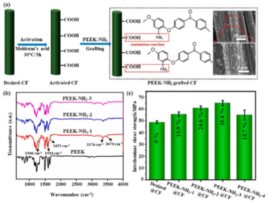 图3所示为CF/PEEK复合材料用PEEK施胶剂:(a)施胶CF表面示意图;(b) CF 表面的 FTIR 光谱;(c) 层间剪切强度。