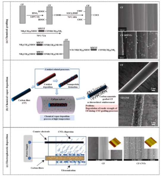 图6所示为在CF表面添加CNTs的方法:(a)化学接枝;(b)化学气相沉积;(c)电泳沉积。