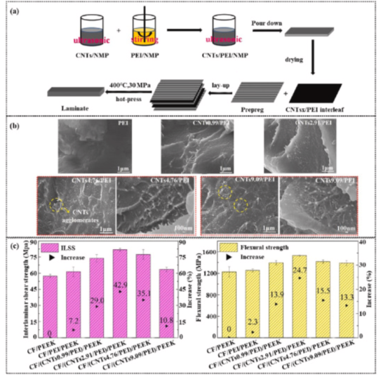 图8所示为嵌入PEEK复合材料之间的 CNTs:(a) CF/CNTs/PEI/PEEK层压板的成型示意图;(b) CF表面的微观形貌;(c) 层间剪切强度和弯曲强度。