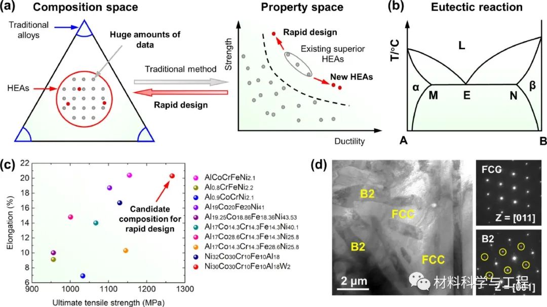 图1(a)快速设计新的HEAs示意图。(b)共晶反应相图。(c)对比文献中铸造FCC/B2 EHEAs的拉伸性能(d) Ni30Co30Cr10Fe10Al18W2EHEA的TEM图。