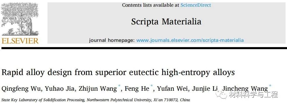 来自西北工业大学的研究人员基于面心立方(FCC)/有序体心立方(B2)EHEA模型系统,开发了两种具有优异力学性能的FCC和B2过饱和高熵HEA。此外,HEAs的定制基体和改性微观结构增强了其性能。相关论文以题“Rapid alloy design from superior eutectic high-entropy alloys”发表在Scripta Materialia。