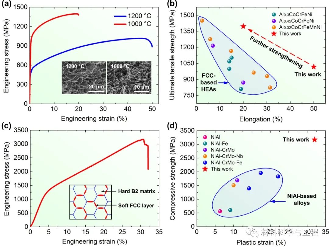 图4所设计HEAs的力学性能。(a) 1200℃和1000℃退火后的HEAs在拉伸应力-应变曲线和断裂的表面。(b)与其他具有少量B2相的fcc基HEAs的拉伸性能比较。(c)铸态b2基HEA的工程压缩应力-应变曲线。(d)与其他NiAl-基合金的压缩性能比较