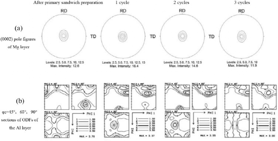 图12 5052/纯Mg/5052在ARB加工过程中的织构演变:(a) (0002) Mg层的极图,(b) Al层的odf