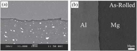 滚压键合过程中,原子在界面处扩散形成扩散层,形成冶金键合。对于 Mg/Al LMC,扩散层包含 Mg (ss)-反应层(γ-Al 12 Mg 17层 +β-Al 3 Mg 2层)-Al(SS)。扩散层的厚度和结构对结合强度有很大影响。一般当扩散层的厚度增加到5μm以上时,界面结合强度就会大大降低。这与反应层脆性 IMCs 的形成有关,这有利于裂纹的产生和扩展。此外,反应层晶粒尺寸和形貌的控制对结合强度也有本质的影响。后退火轧制可有效降低扩散层厚度,使界面处的柱状晶粒细化为等轴晶粒。这种变化有利于界面结合强度的提高。因此,为了提高粘接强度,