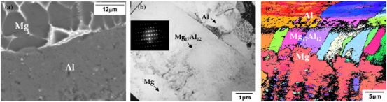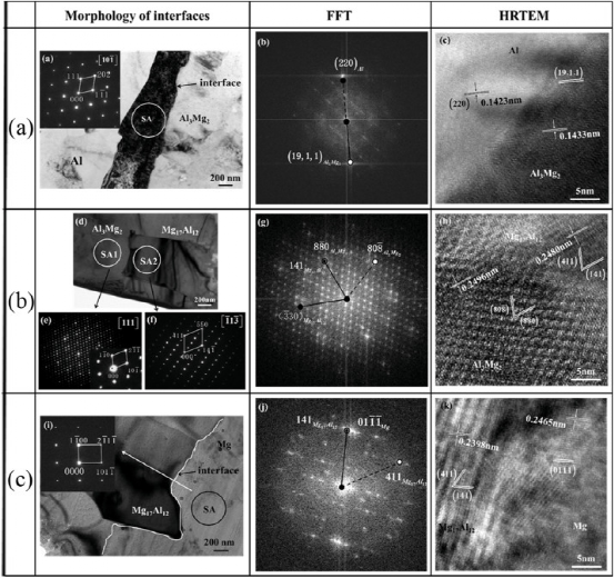 图24 5052/AZ31/5052界面热轧结合和退火后的TEM结果。(a) Al/Al3Mg2, (b) Al3Mg2/Mg17Al12, (c) Mg17Al12/Mg