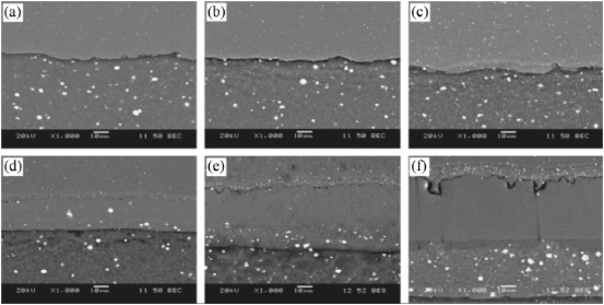 图22 典型的SEM图像显示了Al/Mg/Al复合板在(a)轧制状态和(b) 200°C, (C) 250°C, (d) 300°C, (e) 350°C, (f) 400°C 2h退火状态下的界面微观结构