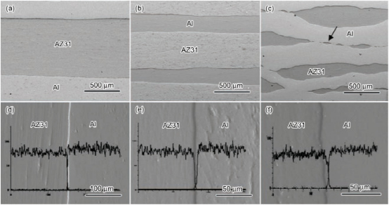 图6 典型的SEM图像显示了多道次轧制Al/Mg/Al LMC的界面微观结构。(a) 1060/Mg-Al-Mn-Ce/1060 LMC, (b) 6061/AZ31/6061