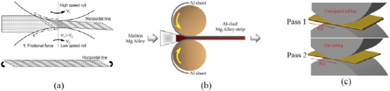 图17 特殊轧辊粘接工艺示意图:(a)差速轧制;(b)双辊浇铸,(c)瓦楞辊+平辊粘接