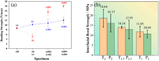 图31 (a)二次轧制对轧制后和退火后3004/AZ34 LMC结合强度的影响。(b)界面形状对轧制6061/ZK60/6061 lcc结合强度的影响(T: 3D形状,P: 2D形状)