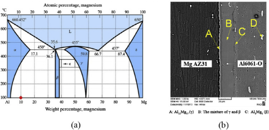 图2 (a) Al-Mg二元相图;(b)扩散键合(450°C/60 min) Mg/Al LMC的SEM-BSE图像
