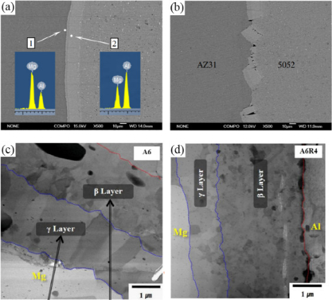 图8 5052/AZ31 LMC辊轧结合界面SEM图:(a) 400℃退火10min后,(b) 400℃退火后第二道次(35%)。3004/AZ31 LMC结合界面的亮场TEM图:(c) 300℃退火60 min后(d) 300℃退火后第二道次(41%)