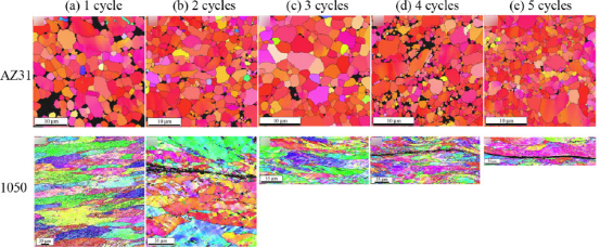 图11 1050/AZ31/1050 LMC经ARB处理后Mg和Al层组织演变的EBSD图:(a) 1循环,(b) 2循环,(c) 3循环,(d) 4循环,(e) 5循环。