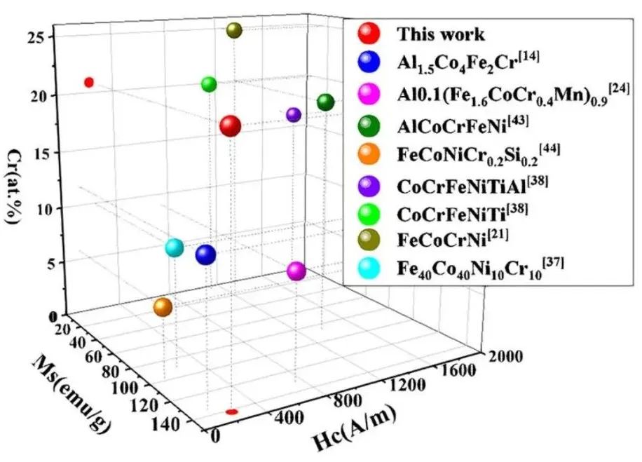 2) 该合金在模拟海水中的耐腐蚀性能优于大多数已报道的软磁高熵合金和传统304不锈钢。