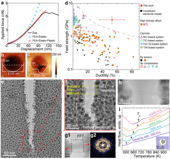 (a) 20 nm厚金属陶瓷纳米片在原子力显微镜 (AFM) 压痕下实验下的力-位移曲线与有限元模拟 (FEA) 的比较。(b-c) Freestanding金属陶瓷纳米薄片在压痕实验前 (b) 和断裂后 (c) 的 AFM 扫描图像。(d) 与其他相关金属和金属陶瓷相比,此高熵合金 (HEA) 衍生金属陶瓷的屈服强度与延展性对比图。(e) 20 nm 厚freestanding金属陶瓷纳米薄片中被阻碍的裂纹的 TEM 图像。(f) 断裂过程区 (fracture process zone) 放大图,如(e)中红框所示。(g1-g2) 高度变形的界面处的非晶陶瓷相的 HRTEM 图像和相应的快速傅立叶转换 (FFT) 图像。(h) 被拉伸至约 500% 的非晶陶瓷界面的 HRTEM 图像。请注意,此图像是两个 HRTEM 图像的拼接。(i) 在不同加热速率下获得的 20 nm 厚freestanding金属陶瓷纳米片的闪光差示扫描量热仪 (F-DSC) 曲线。插图显示了测试前芯片传感器上纳米片样品的照片。