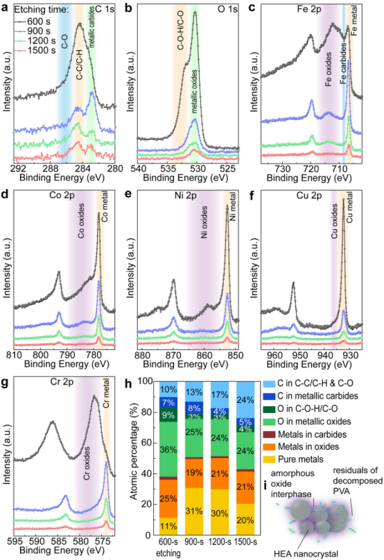 (a-g) 随着蚀刻时间的增加,XPS 光谱窄扫描图,分别为:(a) C 1s, (b) O 1s, (c) Fe 2p, (d) Co 2, (e) Ni 2p, (f) Cu 2p, 和 (g) Cr 2p。(h) 不同蚀刻时间下不同化学键代表物质浓度的定量分析。(i) 金属陶瓷异相结构的示意图。