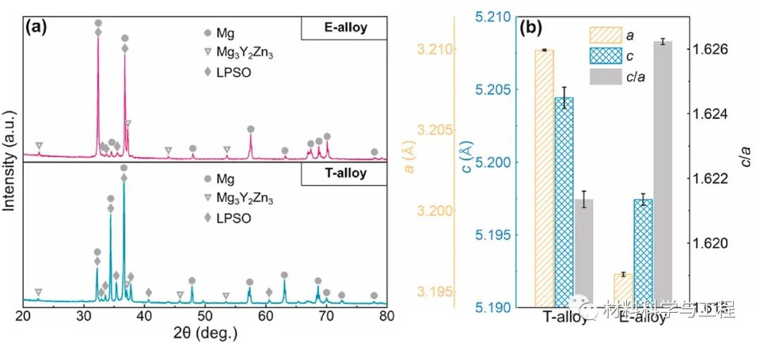 图1 XRD分析:(a) t-合金和e-合金的图样,(b)晶格参数