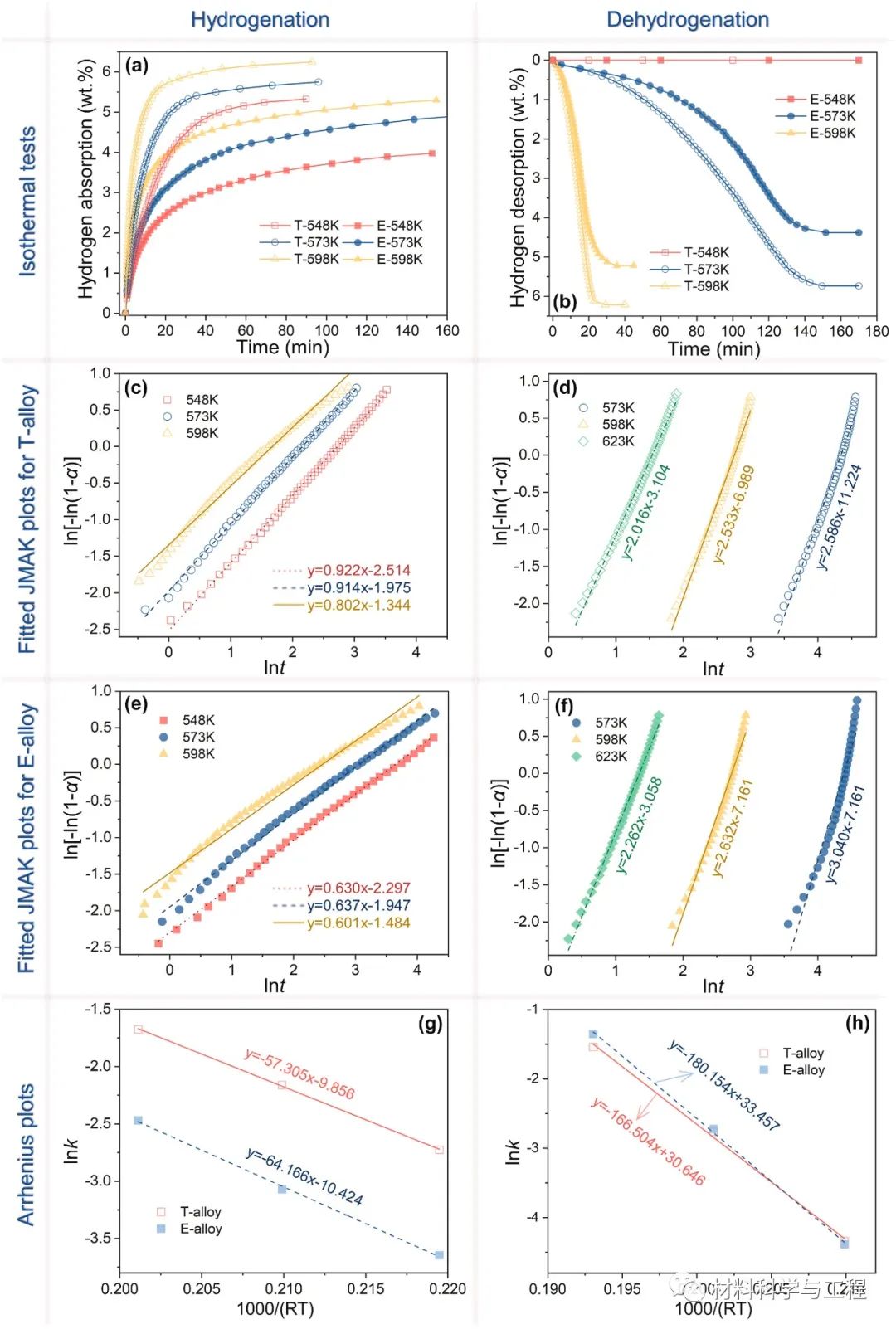 图2动力学分析(a)等温氢化,(b)等温脱氢(c-f) JMAK拟合图,(g-h) Arrhenius图。