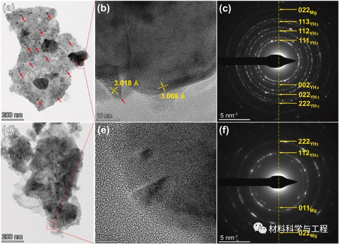 研究发现固溶处理合金中纳米YH2颗粒能够显著提高氢化反应能力和储氢性能,作者通过透射电镜表征分析得到:固溶处理合金14H型 LPSO结构使得Y能够均匀分布在基体中,其在氢化反应中的分解能够形成纳米YH2颗粒从而实现储氢性能的提升。
