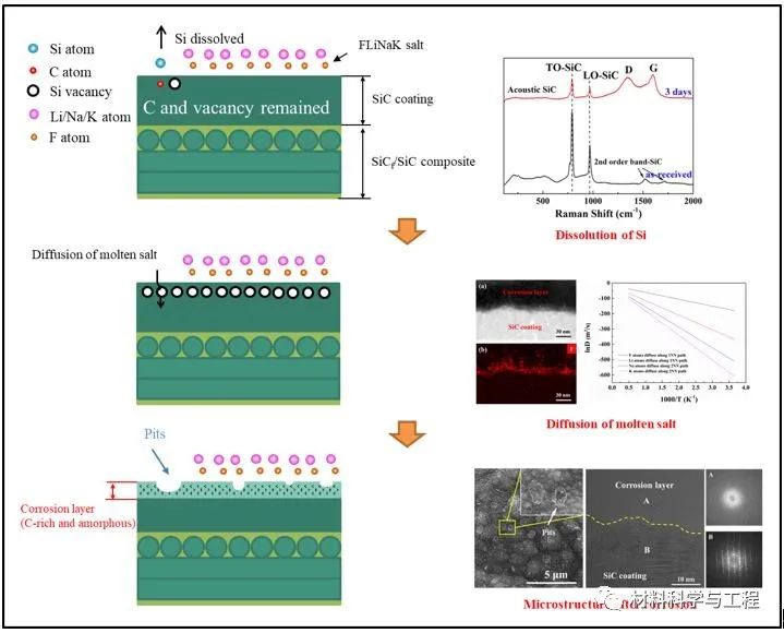 图3 CVD SiC涂层在FLiNaK熔盐中的腐蚀机理:腐蚀开始时SiC内部的Si原子溶解于熔盐中,留下大量空位和C原子,外部熔盐通过Si空位扩散进SiC涂层内部继续腐蚀,随着Si空位的累积,表面形成了富碳的非晶腐蚀层,非晶腐蚀层的局部剥落形成了涂层表面的点蚀坑形貌。