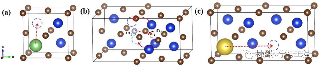 图1 空位辅助扩散机制下,由CI-NBE计算扩散能垒得到不同熔盐原子在SiC内的扩散路径。(a) Li原子扩散路径;(b) F原子扩散路径;(c) Na/K原子扩散路径。