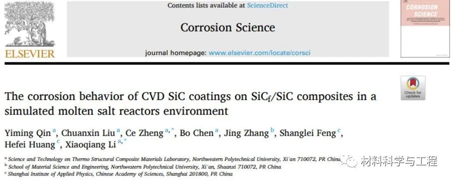 西北工业大学材料学院李晓强教授团队同中国科学院上海应用物理研究所合作,开展了SiCf/SiC在钍基熔盐堆工况下的腐蚀行为研究,相关研究成果以The corrosion behavior of CVD SiC coatings on SiCf/SiC composites in a simulated molten salt reactors environment为题发表在Corrosion Science上,课题组秦一鸣博士为第一作者,郑策副教授和李晓强教授为共同通讯作者。